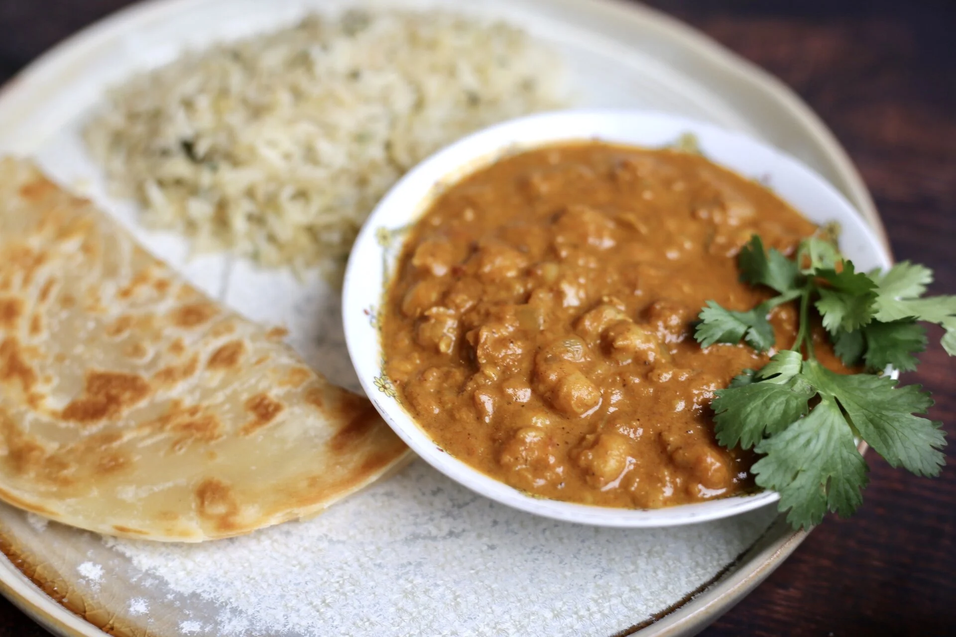 Garnish with chopped cilantro, white or cilantro lime rice and naan.