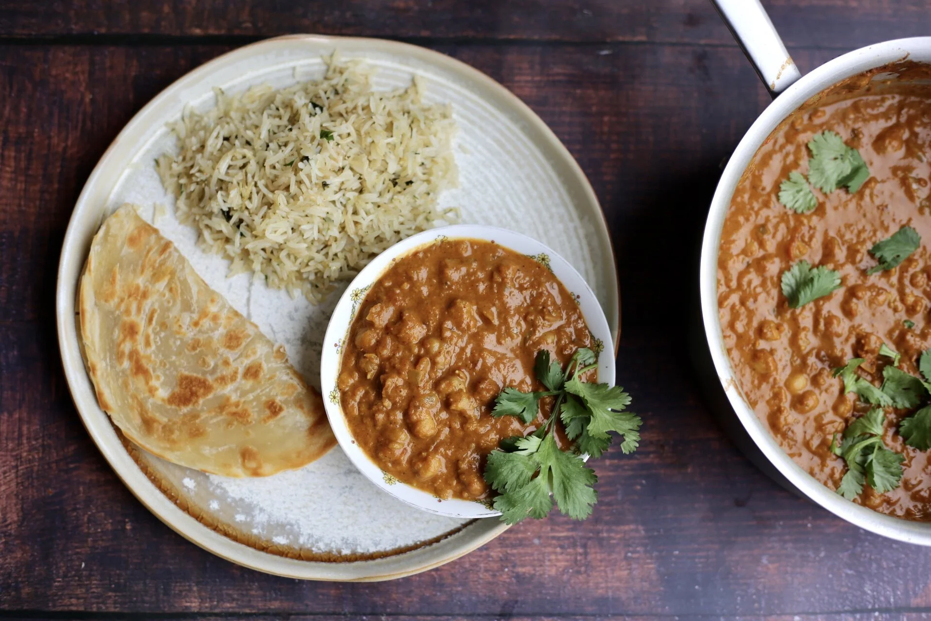 Chicken Tikka Masala is a beloved takeaway dish in England, very much in the same way we Americans love our pizza, burgers and tacos. I created this plant-based version for a friend in need of a vegan coconut curry recipe. His husband is vegan and he wanted to make something special for his birthday. I immediately thought of a Thai curry but I wanted to offer something that could be made with basic pantry staples and that’s when Tikka Masala came to mind. I adapted my go-to chicken tikka masala recipe and swapped out the heavy cream with full fat coconut milk, chose chickpeas instead of chicken and the result is a saucy bowl of warm Indian flavors. Garam Masala is a blend of warm spices like cardamom, cinnamon, cloves, cumin and coriander. It’s the key flavoring ingredient in this dish, and although not a pantry staple for non-South Asians, I would highly suggest adding a bottle to your spice cabinet. Same goes for turmeric. Both add a lot of flavor to lentil soups, vegetables and marinades. I use the Frontier brand which you can find at Whole Foods. As for the coconut milk, start with a 1/2 a can and add more to taste but don’t add too much otherwise you risk losing the tanginess from the tomatoes.