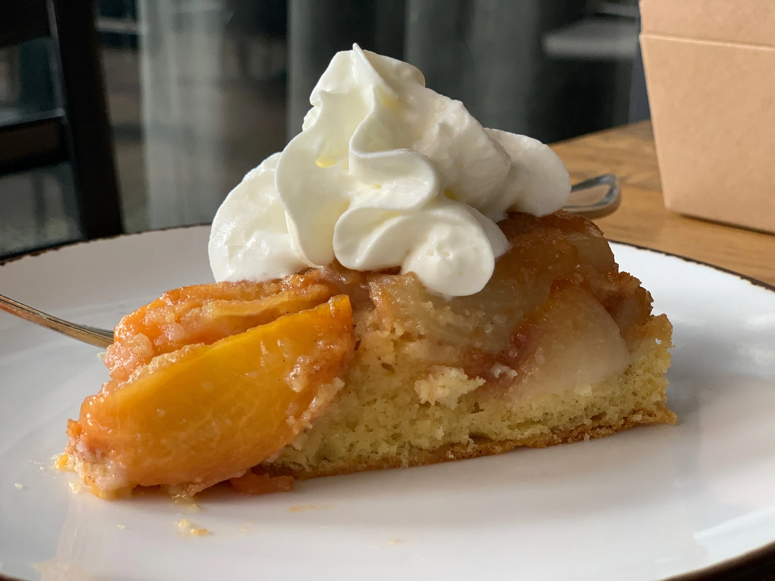 Bake for 30-35 minutes (my oven took the full 35 minutes). Test with a wooden toothpick until it comes out clean. remove from the oven and set on a cooling rack for about 10 minutes. Run a knife around the sides, place a platter on top and invert the cake onto the platter. If any of the peaches stick to the pan, lift them out and replace them on top of the cake. Serve the cake warm or cooled to room temperature with whipped cream or ice cream on the side.